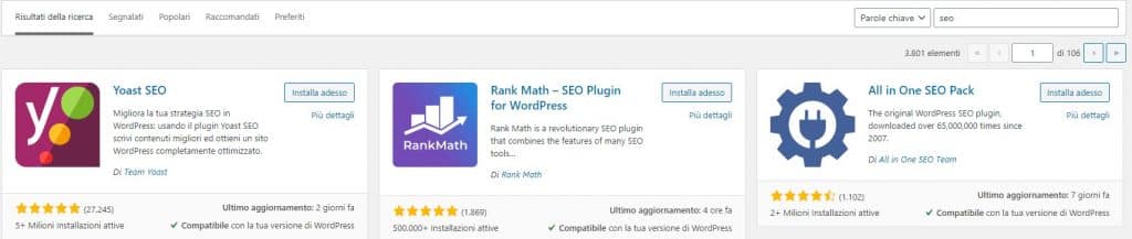 A questo punto avremo una lista di plug-in in seguito alla ricerca: WordPress mette in cima ai risultati di ricerca i plug-in più popolari mostrando inoltre il numero di installazioni attive e il voto medio degli utenti, per permetterci di capire subito quali sono i e migliori nonché più popolari tra gli utenti di WordPress.