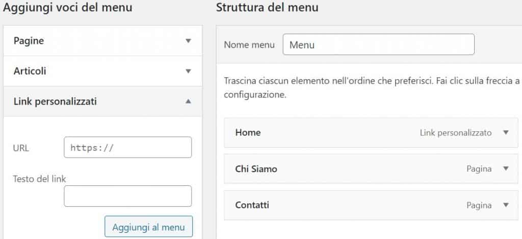 Occorre creare dei menu mediante i quali è possibile navigare nel blog nelle diverse sezioni. Portiamo il cursore su Aspetto e scegliamo la voce Menu. Se vogliamo associare un menu a una pagina, un articolo o una categoria espandiamo il pannello sinistro, scegliamo la pagina di interesse e aggiungiamola al menu. In questo modo, anche qualora dovessimo cambiare il link della pagina, il link funzionerà correttamente.